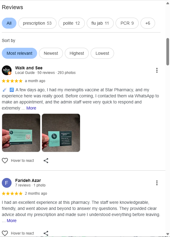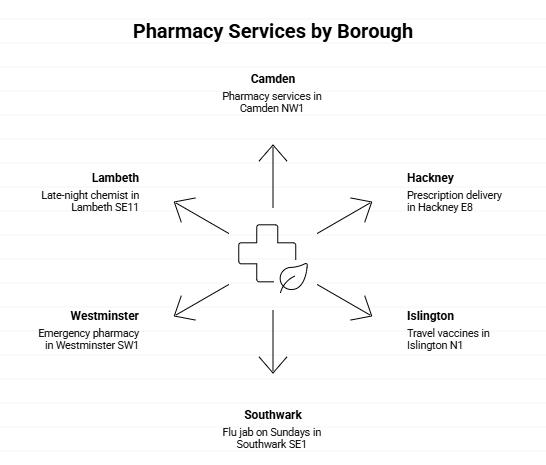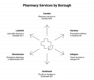 Google Posts: Create weekly posts highlighting services with borough mentions. “Walk-in flu jabs now available at our Islington N1 pharmacy. Open Saturday and Sunday.”